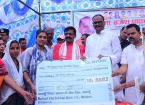 गया हैं जिससे वह अपना कारोबार आगे बढ़ाकर अपने परिवार को खुशी प्रदान कर सकती हैं। इसीलिए प्रधानमंत्री जी ने ऐसी योजनाओं को लागू करने का काम किया है। मुख्यमंत्री योगी आदित्यनाथ जी ने 2017 से जब से सरकार संभाली है कानून का राज कायम हुआ है। प्रधानमंत्री जी की जो भी योजनाएं थी उनको जमीन पर उतार कर उत्तर प्रदेश देश में प्रथम नंबर पर आ गया है। बदायूं या फिर प्रदेश का कोई भी जिला हो। गुंडे मवाली, माफिया खाली स्थानों पर कब्जा कर कर बैठते थे खाली जमीन खेत पर कब्जा कर
