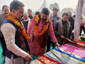 बदायूँ : 06 जनवरी। स्टेट हैंडलूम एक्सपो हथकरघा बुनकर मेला 2024 का शुभारंभ बदायूं क्लब बदायूं में शनिवार को केंद्रीय राज्य मंत्री सहकारिता बी0एल0 वर्मा, सदर विधायक महेश चंद्र गुप्ता, जिलाध्यक्ष राजीव गुप्ता ने फीता काटकर व मां सरस्वती की प्रतिमा के समक्ष दीप प्रज्वलित कर किया। केंद्रीय राज्य मंत्री ने आमजन से मेले का लाभ उठाने के लिए कहा। जनप्रतिनिधियों व अधिकारियों ने मेला परिसर में लगाई गई विभिन्न स्टॉल्स का अवलोकन कर उसे सराहा। स्टार शाइन एकेडमी के बच्चों द्वारा गणेश वंदना की मनमोहक